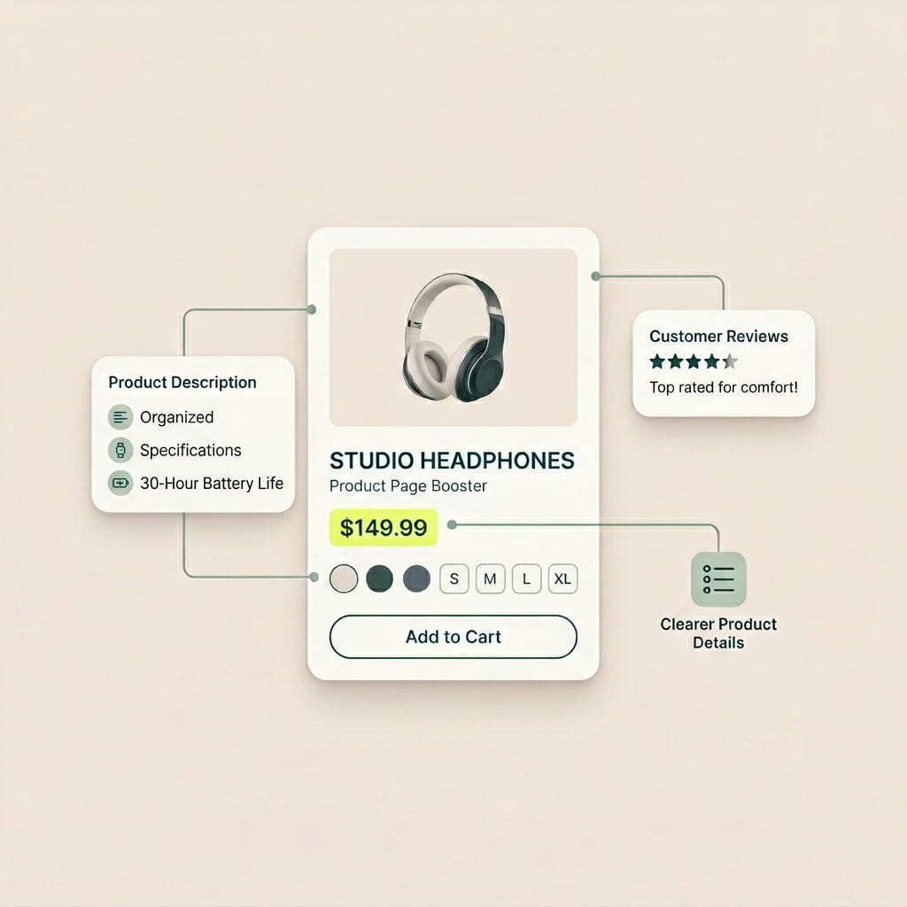 Product Page Booster helps ecommerce teams improve product pages with clearer structure, stronger buying cues, and focused updates that support better conversion.
